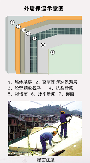外墻保溫是由聚合物砂漿、玻璃纖維網(wǎng)格布、阻燃型模塑聚苯乙烯泡沫板(EPS)或擠塑板(XPS)等材料復(fù)合而成,現(xiàn)場(chǎng)粘結(jié)施工。