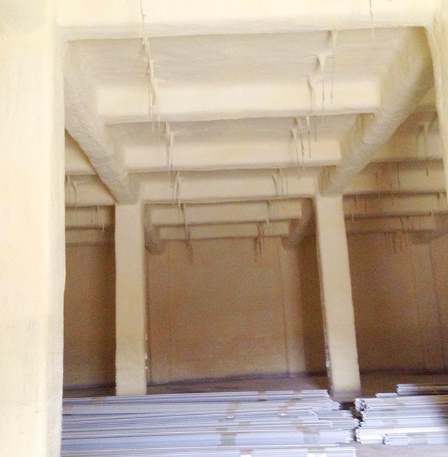 每涂一層要求2-4cm厚,根據(jù)用戶要求噴涂施工,一般恒溫庫外墻15cm,內(nèi)墻12cm,低溫庫外墻18cm、內(nèi)墻15cm;速凍間外墻20cm,內(nèi)墻18cm。